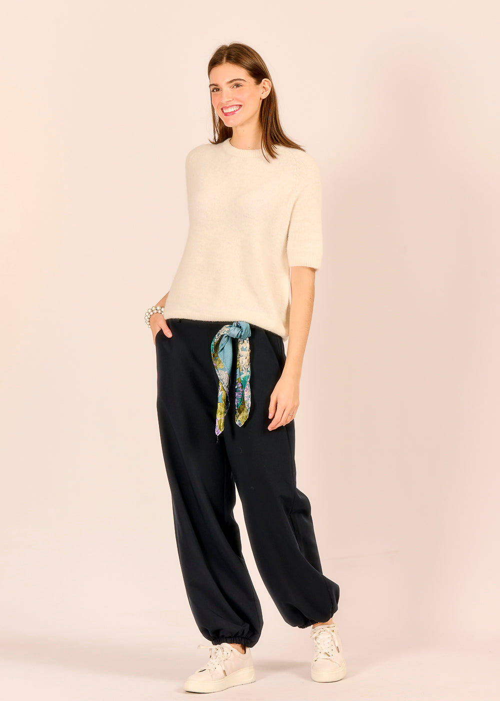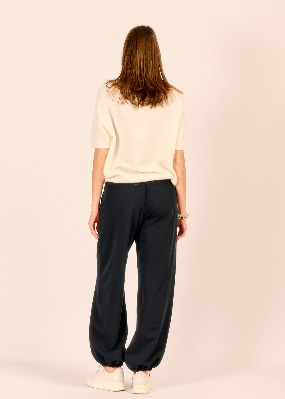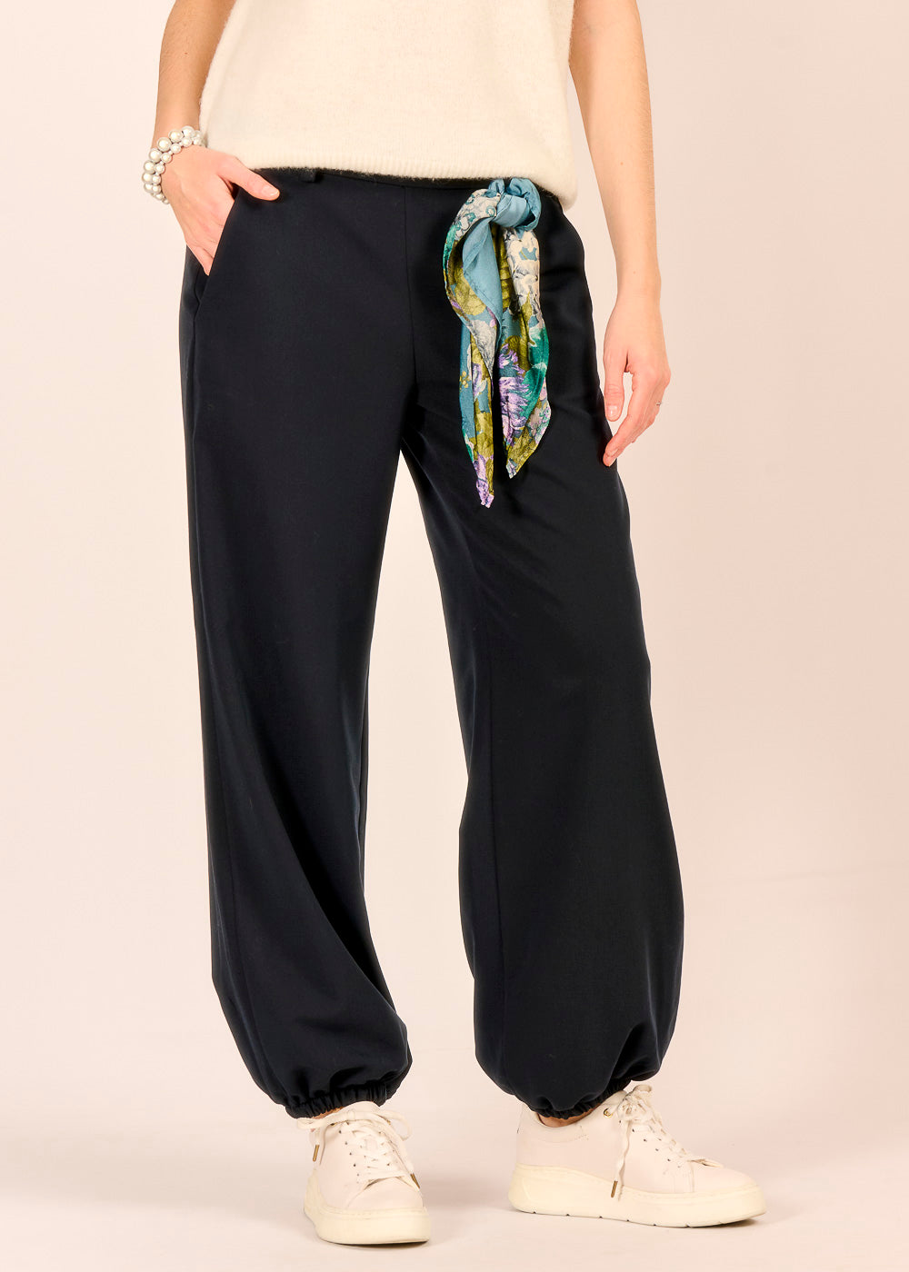 Diese dunkelblaue Stoffhose wirkt durch den elastischen Beinabschluss stilvoll und lässig zugleich. Das edle Tuch-Detail ist ein besonderer Blickfang und verleiht dem Design eine persönliche Note.