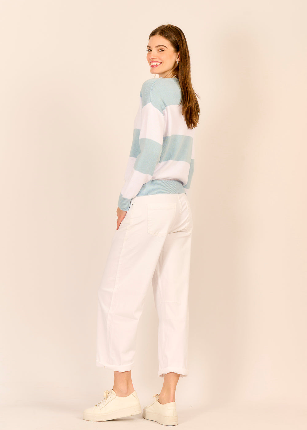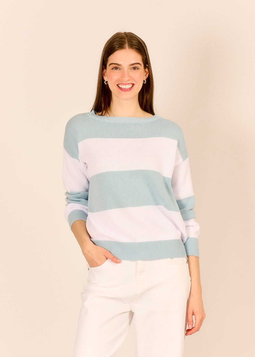 Der Ringelpullover zaubert die frische Brise an der mediterranen Küste in dein Outfit. Baumwolle sorgt für ein angenehmes Tragegefühl. Ob zur Jeans oder Pantalone kombiniert – der Pullover mit modischen Blockstreifen ist ein vielseitiger Alltagsliebling.